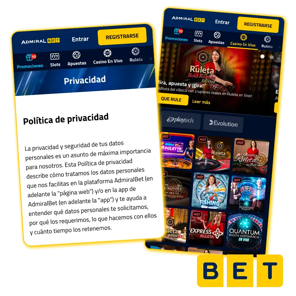 Si descargas la aplicación AdmiralBet, las reglas no cambiarán. Se recopilan y utilizan los mismos datos que en el sitio web. Todas tus acciones en la aplicación (juegos, depósitos, retiradas) se registran y procesan de acuerdo con la misma política de privacidad.