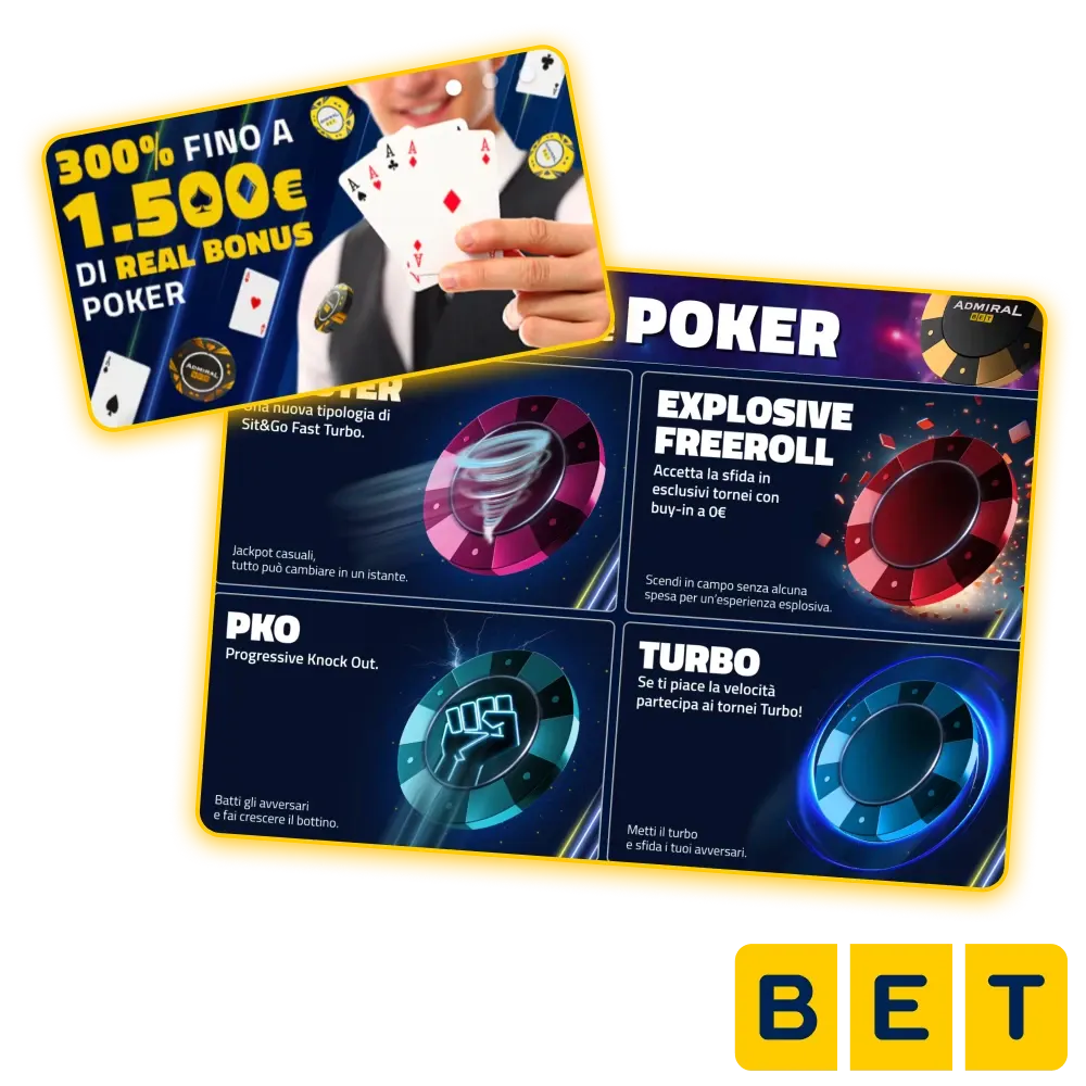 Il poker riguarda decisioni rapide, gestione del bankroll e matematica precisa. Offriamo tavoli cash e tornei per tutti i limiti, una lobby unica per PC, iOS e Android, e filtri per formato e puntate. Puoi giocare su tutti i dispositivi da un unico account, con protezione dei dati e impostazioni del tavolo comode. I nuovi giocatori hanno diritto a un Bonus di Benvenuto Poker del 300% sul primo deposito fino a 1.500 EUR (un bonus poker progressivo, accreditato secondo i termini e le condizioni nella sezione promozioni). AdmiralBet poker opera in euro e sotto la licenza ADM n. 15096.